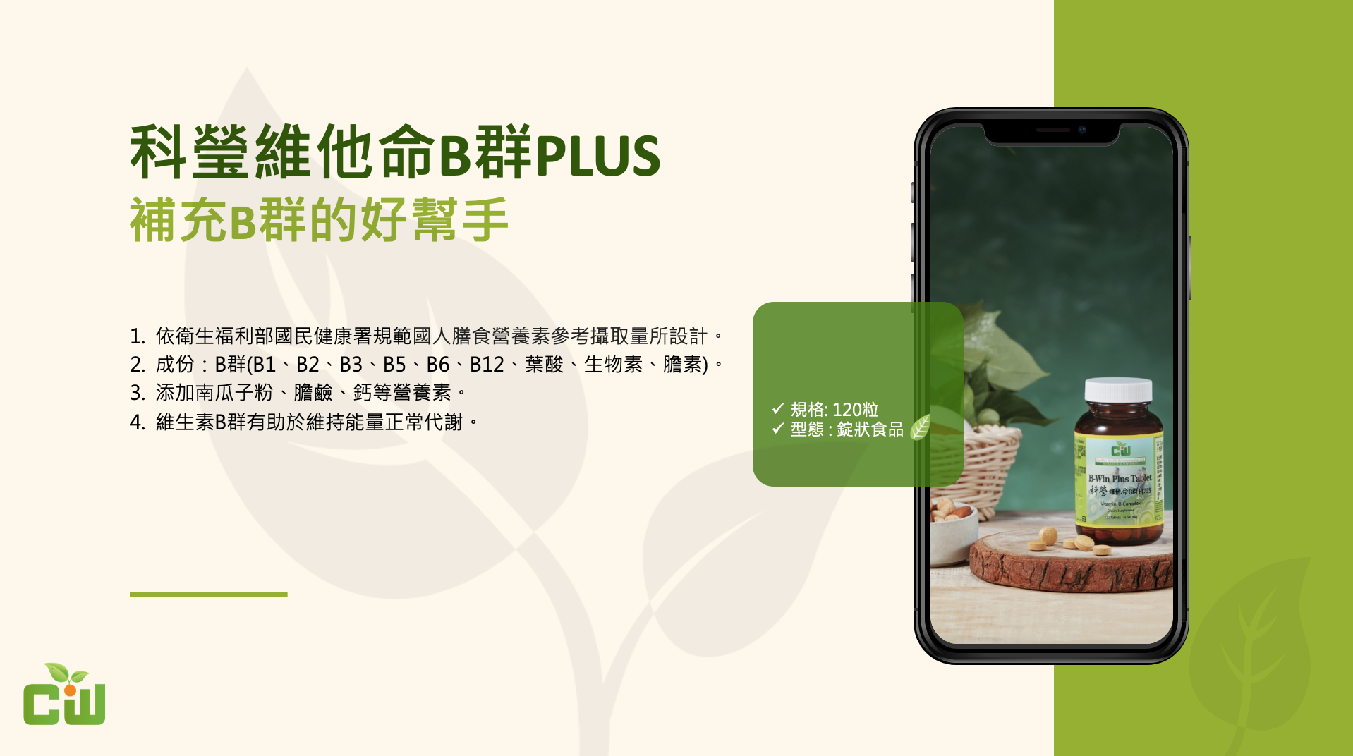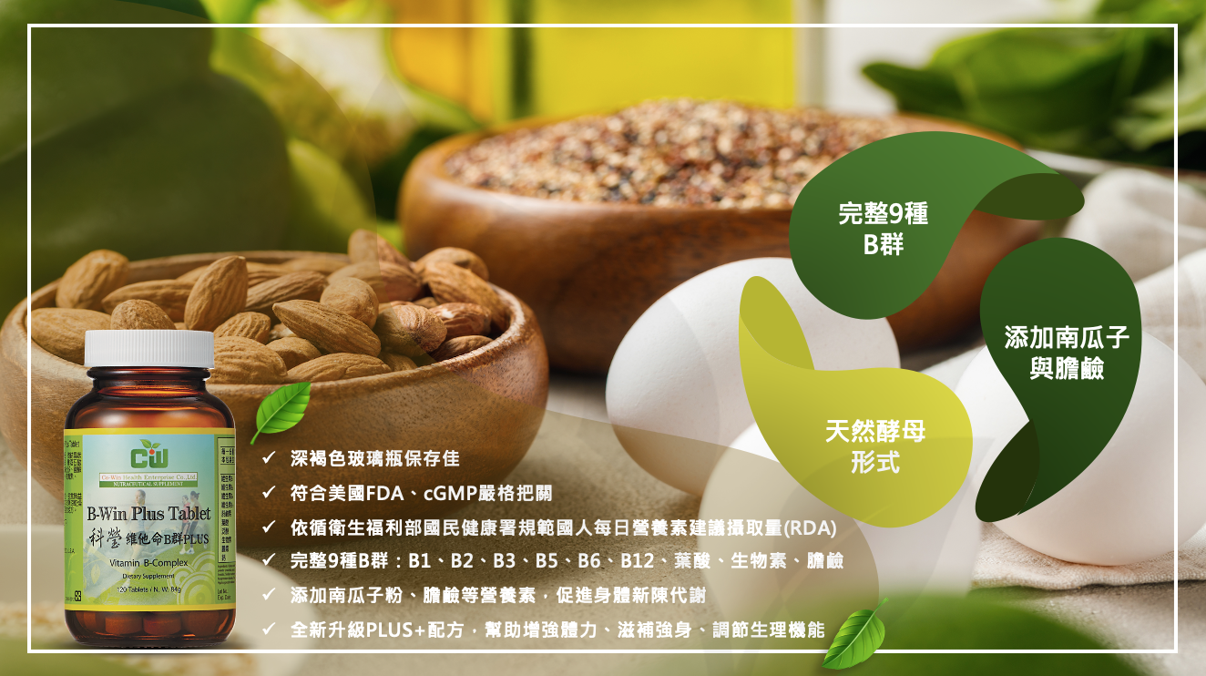 2. 成份:B群(B1、B2、B3、B5、B6、B12、葉酸、生物素、膽素)。